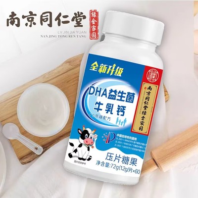 【11.9元秒杀到手3瓶!记得拍3件】南京同仁堂DHA益生菌牛乳钙60片,一瓶三补,中老年人儿童、学生成人钙、咀嚼片,男女通用!!