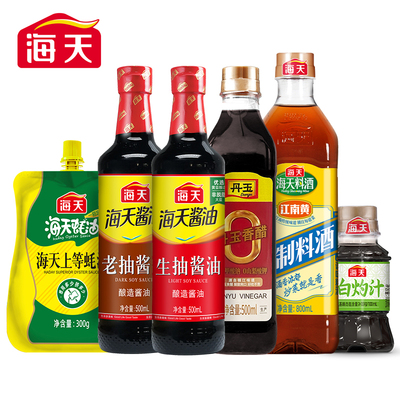 海天旗舰店调料6件套组合,包含:生抽500ml+老抽500ml+料酒800ml+蚝油300g+零系丹玉香醋500ml+鲜的白灼汁100ml!