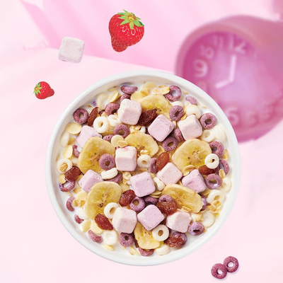 桂格麦果脆草莓牛乳麦片,5大宝藏食材,草莓、葡萄干、燕麦片、香蕉、牛乳,75%多谷物配方,多种场景享受营养早餐。
