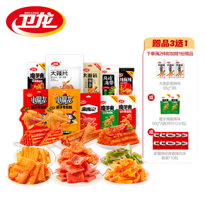 划重点:赠品都是值钱货!线下5.9亓面筋当赠品送! 卫龙食品旗舰店•爆款零食组合 任选⑦件13.17亓 含赠蕞低到手10件,折1.8亓/件!! (任选3个以上不同选项,价格才成立!) 这次加了小龙虾口味的魔芋爽和大面筋,都是新品! 能把辣条卖上市的也只有卫龙了!放心吃干净! 赠品不知道选啥闭眼选大面筋!唇齿留香!爽!