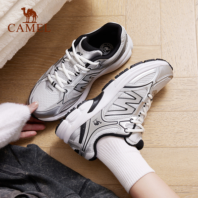 骆驼2025秋新款女款银色老爹鞋,耐磨网面设计,复古休闲风格,舒适缓震,适合日常穿搭和轻运动。