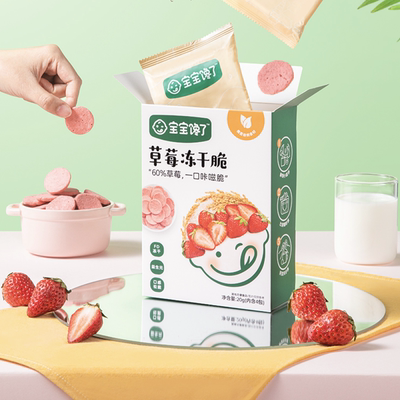 60%草莓,自然酸甜,无添加,非油炸,更健康的松脆,优选海藻糖,更安心,独立小包装,卫生便携,华测检测合格,放心吃!