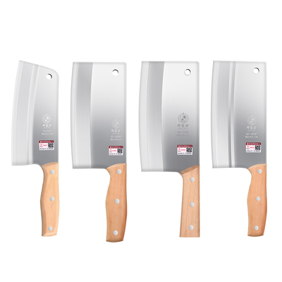 四种型号邓家刀,均为4cr13不锈钢材质,分别为多功能辅食刀NS-2618、女士切片刀QD-6034P、通用切片刀QD-603P、斩切两用刀ZD-6035P,不同重量,同样价格。v型切面,背厚口薄,锋利持久。
