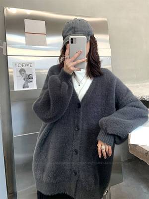 水貂绒慵懒风加厚V领针织开衫女秋冬新款韩