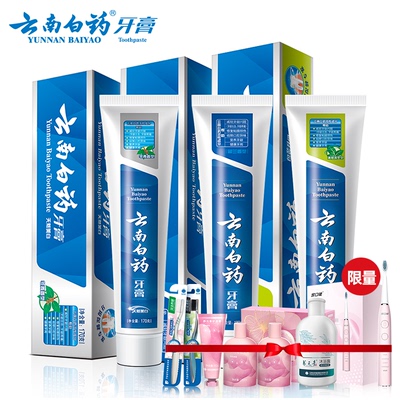 ①买1赠牙刷2支!+正装沐浴露400ml ②买2套送价值¥119桃花洗沐三件礼盒(洗发露230ml+沐浴露230ml+护发素80g) ③0.01会员礼:赠正装漱口水100ml 云南白药大牌牙膏3+2套装!三管齐下,正品官旗云南白药牙膏,沈腾,赵丽颖,宋轶,张若昀代言过的牙膏,毛不易,苏有朋推荐!草本呵护口腔~去口臭,美白健齿!【赠运费险】