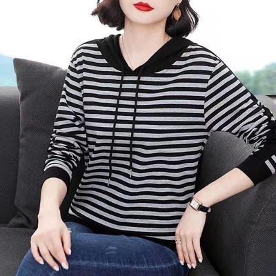 2022秋季新款纯棉宽松条纹连帽长袖t恤上衣